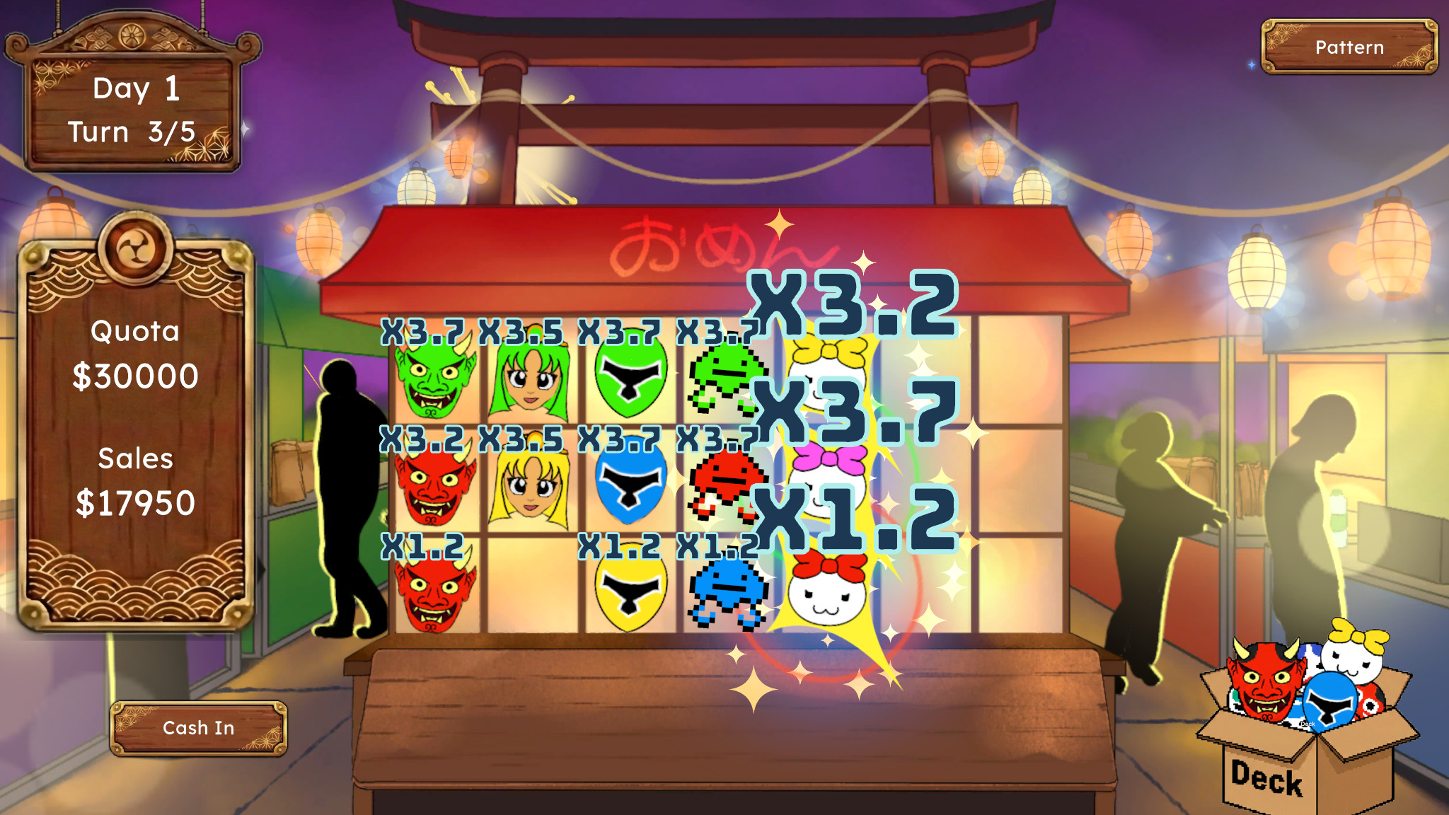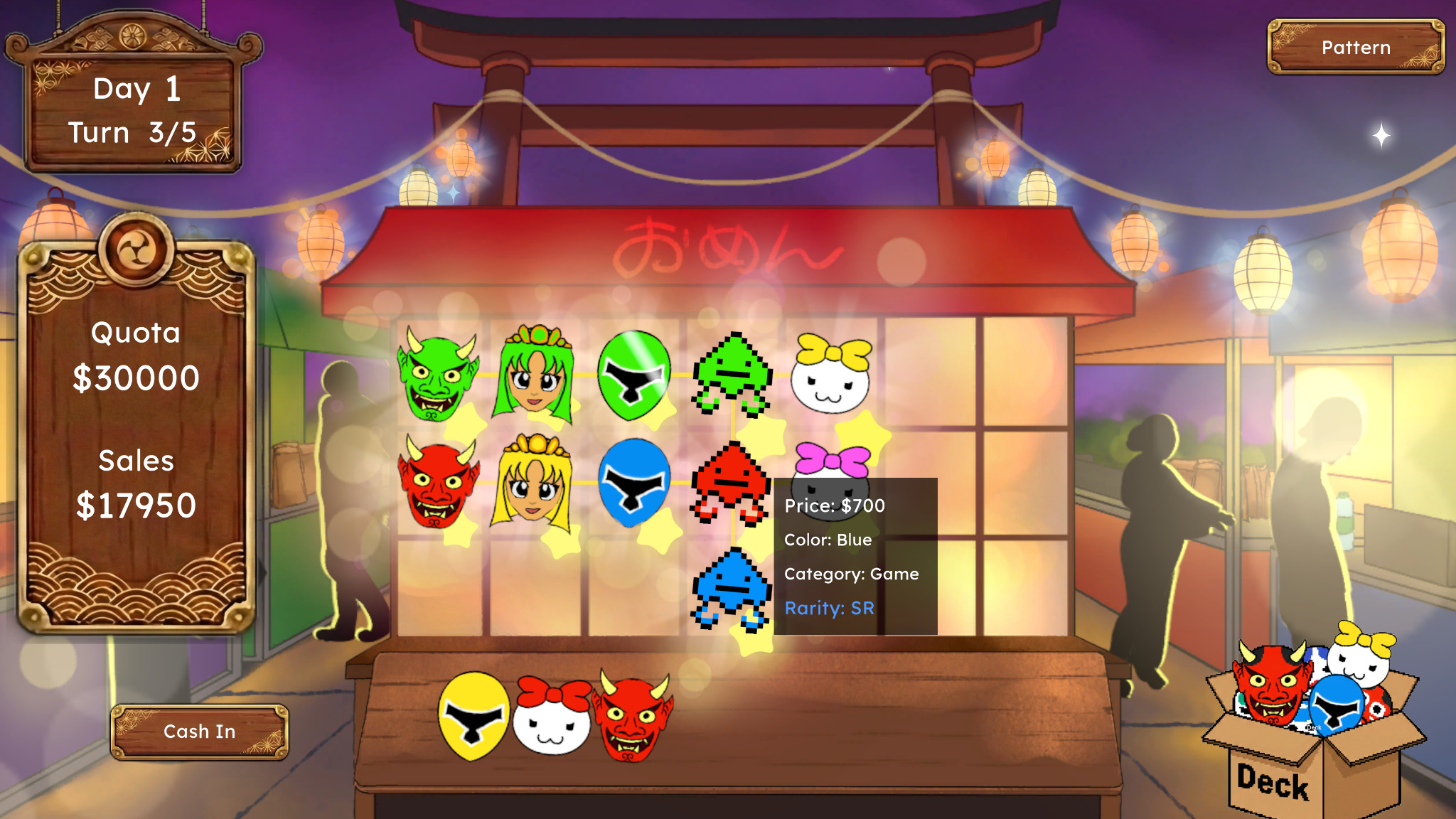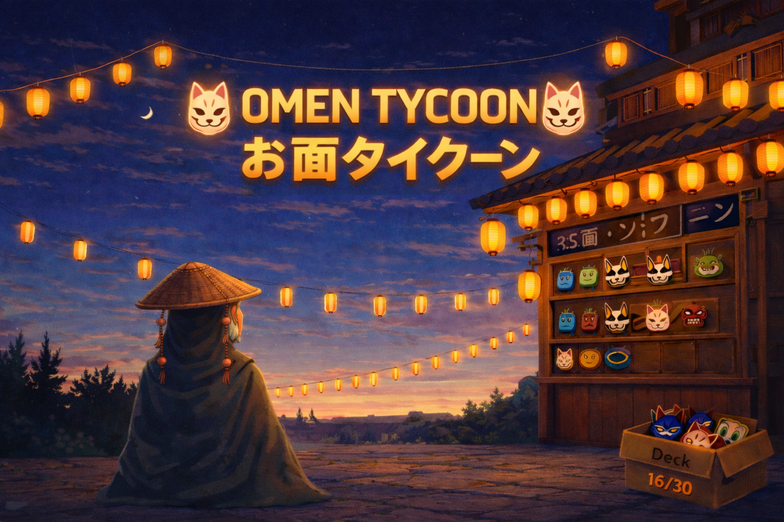 OMEN TYCOON is a Balatro-inspired, turn-based score-building roguelike set in a mysterious Japanese festival.