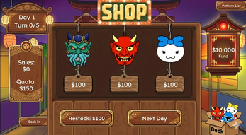 お面を並べて客を呼び、5日間続く厳しい売上ノルマを突破せよ。